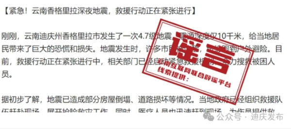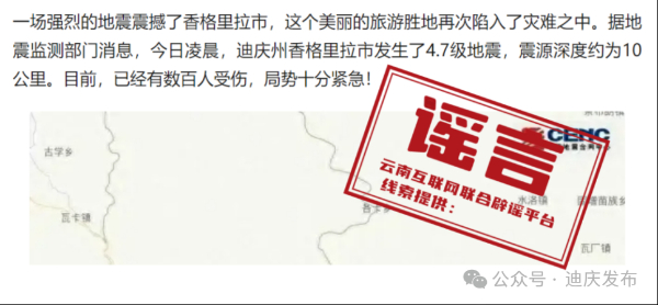 云南迪庆香格里拉市4.7级地震中,有数百人受伤? 2024-04-12 09:43 2024年4月9日22时07分香格里拉市发生4.7级地震,目前,暂未收到人员伤亡报告,当地通讯、供电、交通正常。 有部分自媒体为博眼球、蹭流量,运用拼凑网络旧图、旧视频等手段,发布香格里拉地震不实图文、音视频等信息严重误导网民。