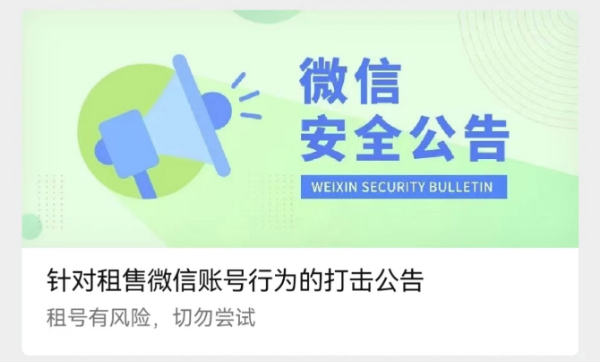 4月10日,微信安全中心发布《针对租售微信账号行为的打击公告》,提醒用户切勿尝试租售微信账号,公告全文如下: