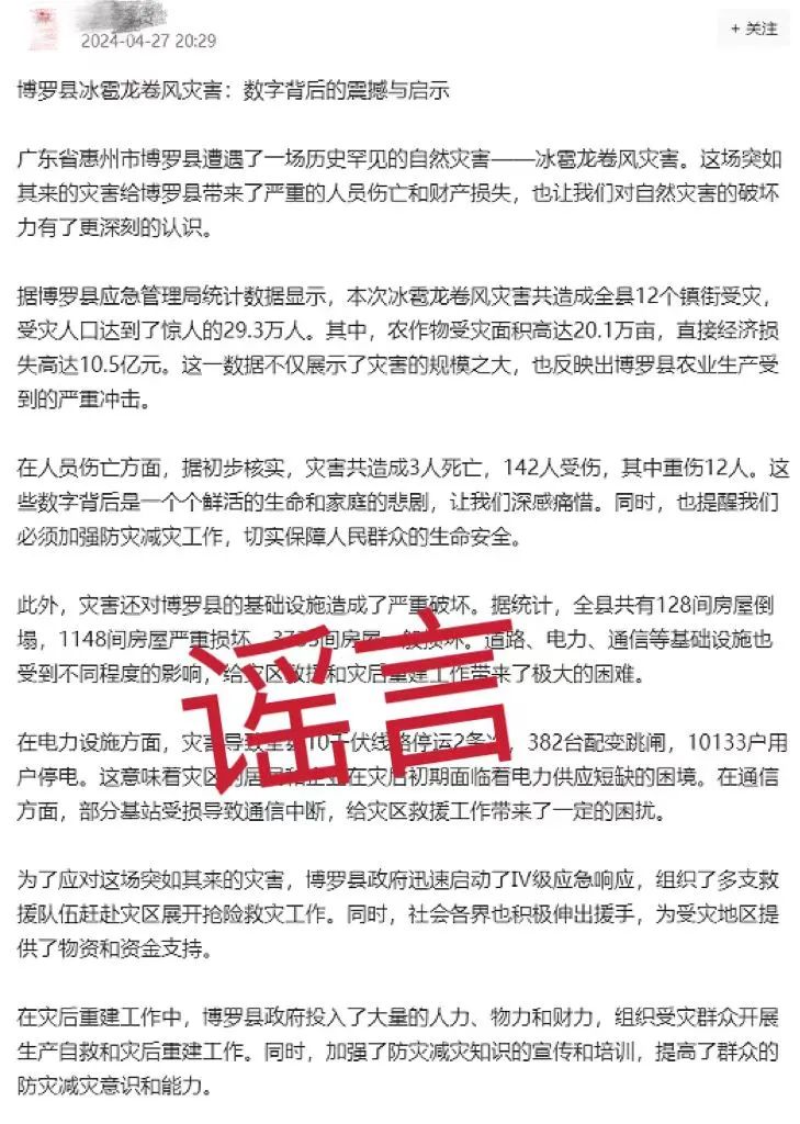 广东惠州博罗公安依法处置一起“谎报险情”网络谣言案 2024-05-13 09:29 为有效净化网络环境,惠州博罗公安持续加大对网络谣言的打击力度,依法查处网上制造传播谣言的违法行为。近日,博罗县公安局成功处置一起“谎报险情”的网络谣言案件。 4月27日,博罗公安在工作中发现,有网民在某平台发布贴文,称“博罗县遭遇一场历史罕见的自然灾害-冰雹龙卷风”“灾害造成3人死亡,142人受伤,其中重伤12人”。 经公安机关核实,该网民所述为谣言,随即依法将其传唤至公安机关。经审讯,网民黄某红为博取关注,通过某AI软件生成该贴文,在未经核实的情况下就通过某平台发布,其行为涉嫌散布谣言、谎报险情,极易造成公众恐慌和焦虑,严重扰乱公共网络秩序。博罗公安依法对黄某红作出行政处罚,并责令其删除相关谣言。