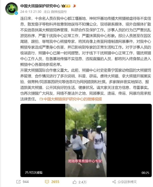 有人“尾随辱骂熊猫专家、制造网暴”,熊猫中心:已报警 2024-06-14 14:45
