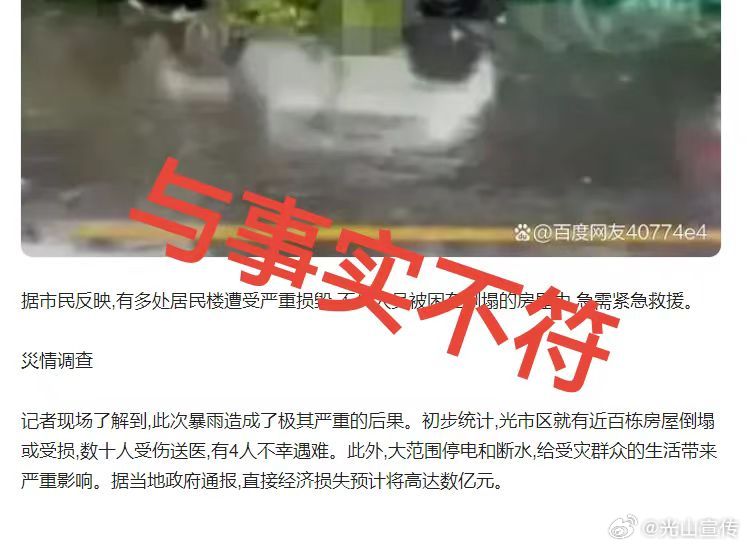 6月17日,有网民在网络平台散布消息称,“信阳市光山县狂风暴雨致多人死亡”。经光山县应急管理局核实,无人因灾伤亡,相关信息均为谣言。