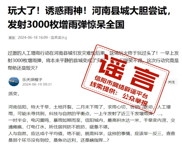 近日,有网民在今日头条等平台散布消息称,“河南信阳发射三千发增雨弹引发暴雨”。