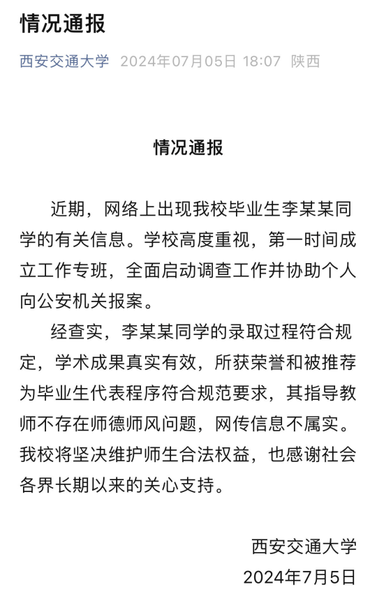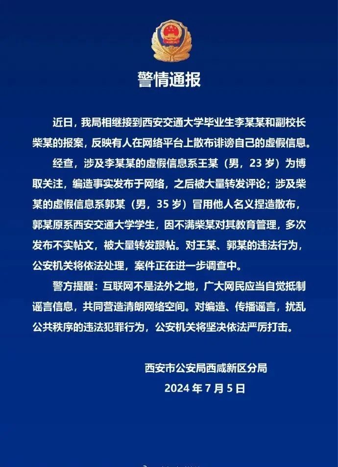 随后,“西咸公安”微信公众号也在7月5日发布《警情通报》称,该局相继接到西安交大毕业生李某某和副校长柴某的报案。经查,涉及李某某的虚假信息系王某(男,23岁)为博取关注,编造事实发布于网络,之后被大量转发评论;涉及柴某的虚假信息系郭某(男,35岁)冒用他人名义捏造散布,郭某原系西安交大学生,因不满柴某对其教育管理,多次发布不实帖文,被大量转发跟帖。对王某、郭某的违法行为,公安机关将依法处理,案件正在进一步调查中。