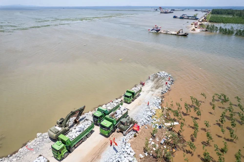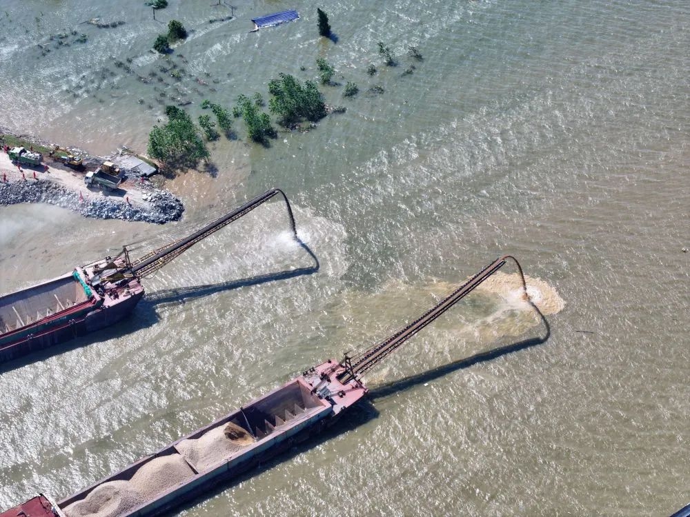 截至8日17时,团洲垸洞庭湖大堤决口封堵长度已达180.5米,剩余45.5米。记者在决口现场看到,一辆辆满载块石、砂卵石的卡车依次在决口两侧投放物料,大型挖掘机、推土机进行填埋作业,大型驳船同步开展水上抛投作业。