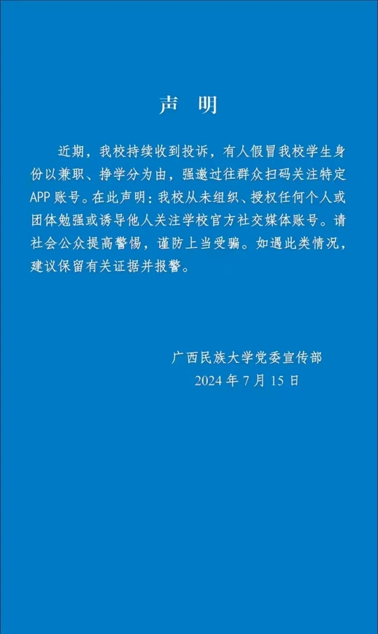 近期,有人假冒广西民族大学学生身份以兼职、挣学分为由,强邀过往群众扫码关注特定APP账号。7月15日,广西民族大学党委宣传部在学校官方抖音号发布声明,表示广西民族大学从未组织、授权任何个人或团体勉强或诱导他人关注学校官方社交媒体账号。