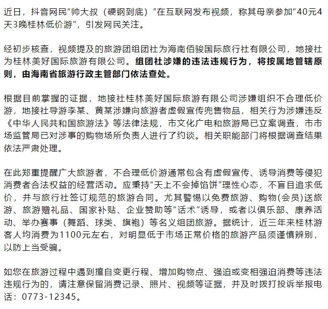 40元桂林4日游?官方通报了 2024-07-17 10:55 桂林市旅游市场综合监管工作领导小组办公室7月16日发布情况通报。全文如下: