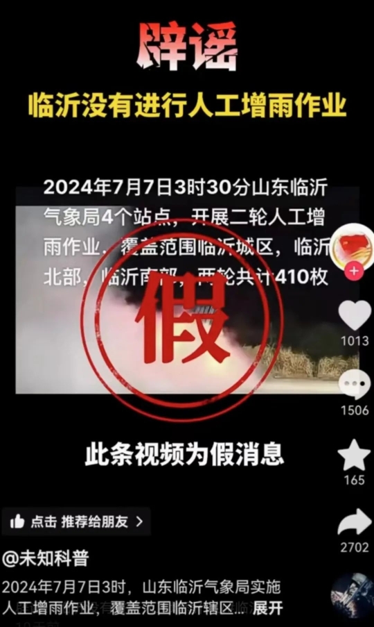 造谣“临沂人工增雨”!徐某某被查处! 2024-07-17 14:32 近日 网民徐某某 因散布谣言称临沂人工增雨 社会影响恶劣 被依法查处
