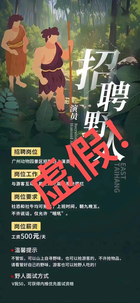 近期,网上流传一张广州动物园招募野人演员的图片。