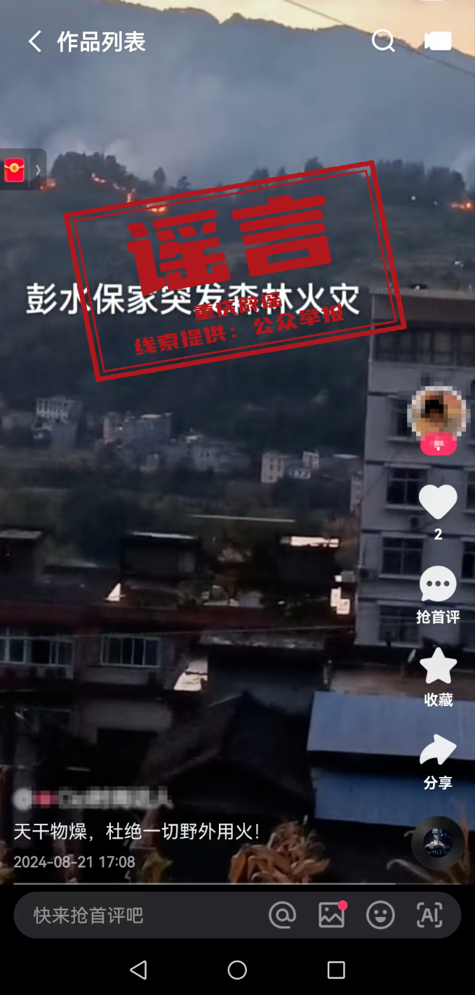 8月21日,某网民发布视频并配文重庆“彭水保家突发森林火灾”,引发关注。经向属地政府部门核实,彭水近期未发生此类事件,网传信息系谣言。