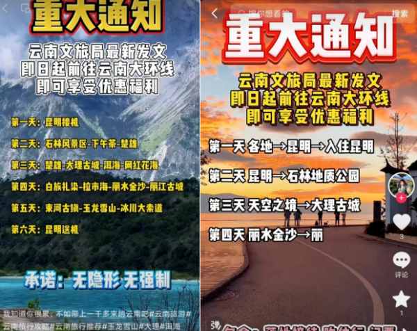 经核实 所谓“云南文旅最新发文 前往云南大环线 即可享受优惠福利”的说法 为不实消息 为保障广大游客的合法权益,云南省文化和旅游厅提醒各位游客在选择跟团游产品时,务必保持警惕,仔细甄别信息真伪。在报名跟团游前,请参考云南省旅行社协会公布的《2024年旅行社云南旅游产品参考成本消费提示》,充分了解旅游产品的成本构成和合理价格区间,避免被“不合理低价游”所诱惑。
