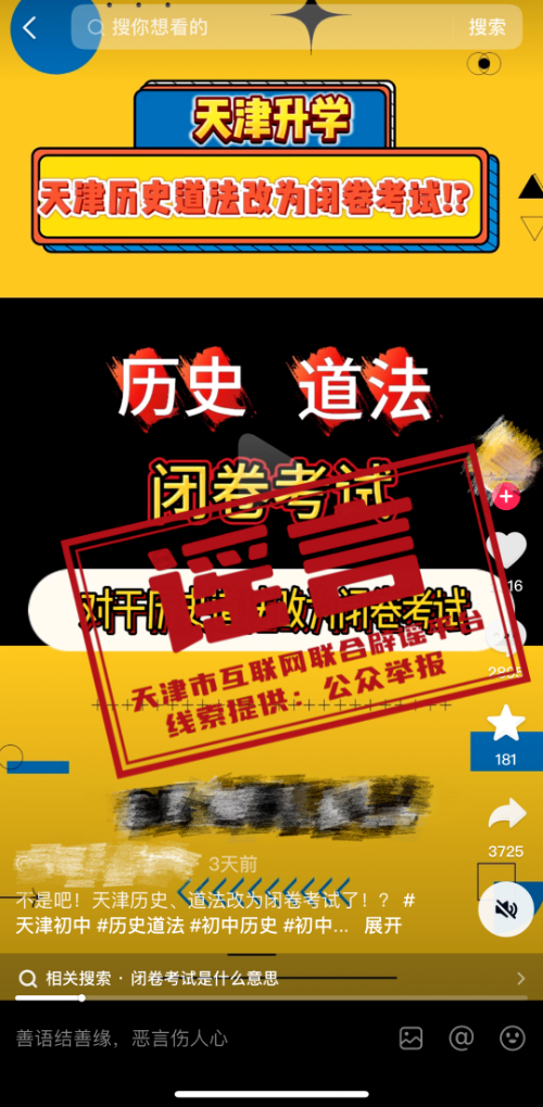 据“天津辟谣”微信公众号消息,接举报,网上正在传播“天津升学历史道法改为闭卷考试”等相关信息,引发部分网民关注。经核实,目前暂无道德与法治、历史等部分学业水平监测由开卷改为闭卷的信息。