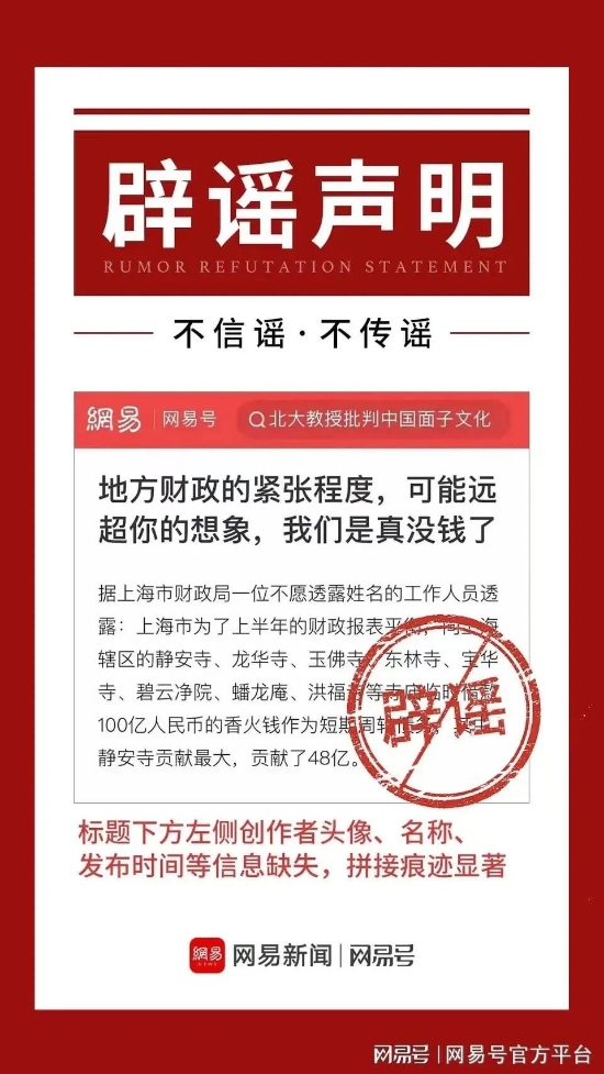 经查,犯罪嫌疑人孙某民主要在长三角地区从事各类商贸活动,其在与他人交往中,时常吹嘘自己能够得到“内部消息”,以营造自己“消息灵通”以及“人脉宽广”的人设。为了让自己的人设更具有可信度,孙某民又学会了使用图片编辑软件,将自己捕风捉影的信息与知名媒体的报头拼接后发给他人,以证实自己消息来源的可靠性。 孙某民编造了“上海财政紧张向寺庙借款100亿”的内容,并从网上搜索了大量上海寺院的名称,然后使用软件添加标志制作成谣言图片,发送给好友,最终造成谣言扩散,形成恶劣社会影响。