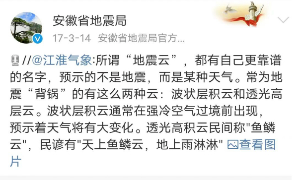 微信公众号“皖美震地”2023年8月就曾科普过:“云形成的整个过程,都是在大气圈当中完成的。而地震是发生在岩石圈里面,所以没有足够的科学依据证明,云可以预示地震的发生。” “网上所谓的‘地震云’,主要是高积云与层积云两种。高积云的出现说明天气很好,层积云的出现代表会有降雨,与地震其实并没有任何关联。” 来源: 安徽省互联网违法和不良信息举报 作者: 编辑:李佳萌 |