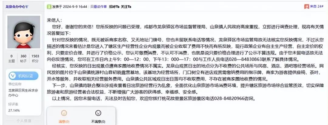 ▲图源群众呼声-四川网络问政平台 网民“阿乀富”吐槽道,没想到在龙泉山看日出也是要花钱的!评论区,不少网民产生共鸣。 @要叫我达令:我也是,感觉被坑了,20块钱就提供一个看的地方,连杯水都没有。 @薰_仔:各个商家都在圈地,视野好的都被圈完了。 @小菜鸟233333:我们铺个垫子,坐着休息,根本没挨着他们摆座位的地方,就是个空地,刚打开垫子,他说要收费,十元一位才可以铺,说那是他们的地方。 官方回应: 不存在商家圈地收费情况 成都市龙泉驿区市场监督管理局、山泉镇人民政府回应称:经核实,该网民反映的日出观景点遭商家圈地收费情况不属实。龙泉山观赏日出的地点涉及不收费的公共场所和民宿、酒店、酒吧等经营场所。网民发的图片位于山泉镇桃源村山音初晓露营基地,为经营场所,商家为游客提供座椅、茶叶、开水等服务,收取相关经营服务费用。山泉镇公共区域观日出日落均不收取费用,不存在被商家圈地收费的情况。