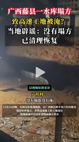 12月16日晚,有网友拍摄视频称,在广西壮族自治区梧州市藤县塘步镇六坊村附近疑因水库塌方,水将高速施工的工地淹没。视频画面中可以看到地面确有积水。
