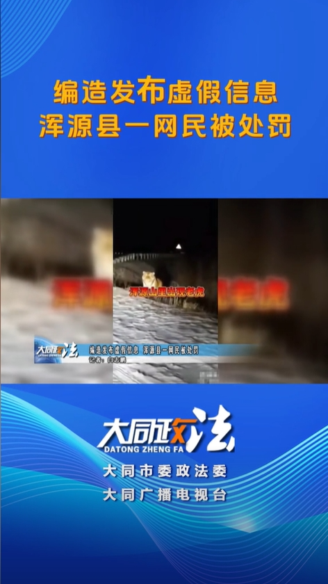 山西浑源山里出现老虎?大同一网民因编造谣言被处罚 2024-12-20 14:54 近日,山西省大同市浑源县一网民在网络平台上散布浑源山里出现老虎的不实信息,在当地引起一定程度的恐慌,严重扰乱当地社会秩序。浑源县公安局民警发现这一视频后立即介入调查,很快找到了这一谣言的编造者陈某。陈某因虚构事实,扰乱公共秩序,被浑源县公安局依法处以行政处罚。