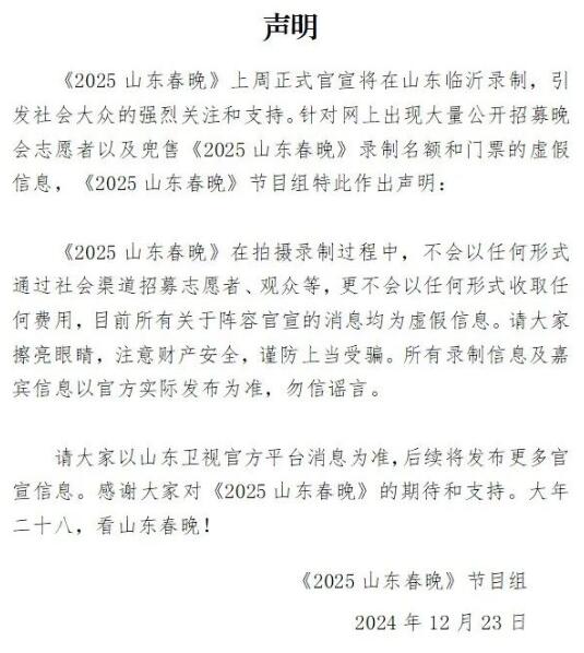 《2025山东春晚》上周正式官宣将在山东临沂录制,引发社会大众的强烈关注和支持。针对网上出现大量公开招募晚会志愿者以及兜售《2025山东春晚》录制名额和门票的虚假信息,《2025山东春晚》节目组特此作出声明。春晚节目组提醒广大网友不要相信、谨防受骗。