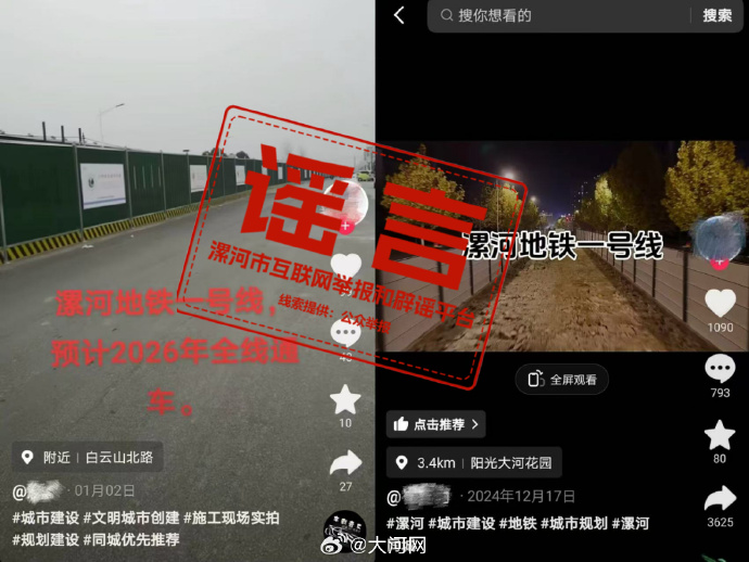 网传河南漯河修建地铁系谣言 2025-01-22 11:25 近日,河南省漯河市委网信办接网民举报,某网络平台多个账号编造传播“漯河修建地铁一号线”的虚假信息,引发网民关注和讨论。