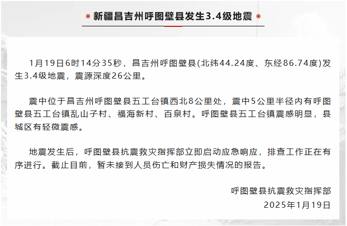 新疆呼图壁县发生3.4级地震,这些网传图文不实! 2025-01-22 11:27 2025年1月19日6时14分35秒,昌吉州呼图壁县(北纬44.24度、东经86.74度)发生3.4级地震,震源深度26公里。震中位于昌吉州呼图壁县五工台镇西北8公里处,呼图壁县城区有轻微震感。经排查,呼图壁县通讯、供电、交通道路等状况正常,未接到人员伤亡和财产损失情况报告。