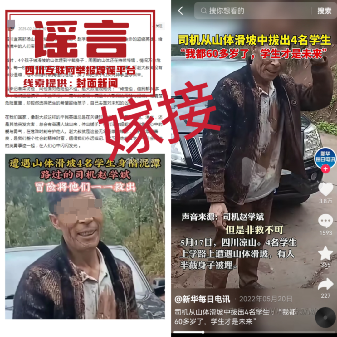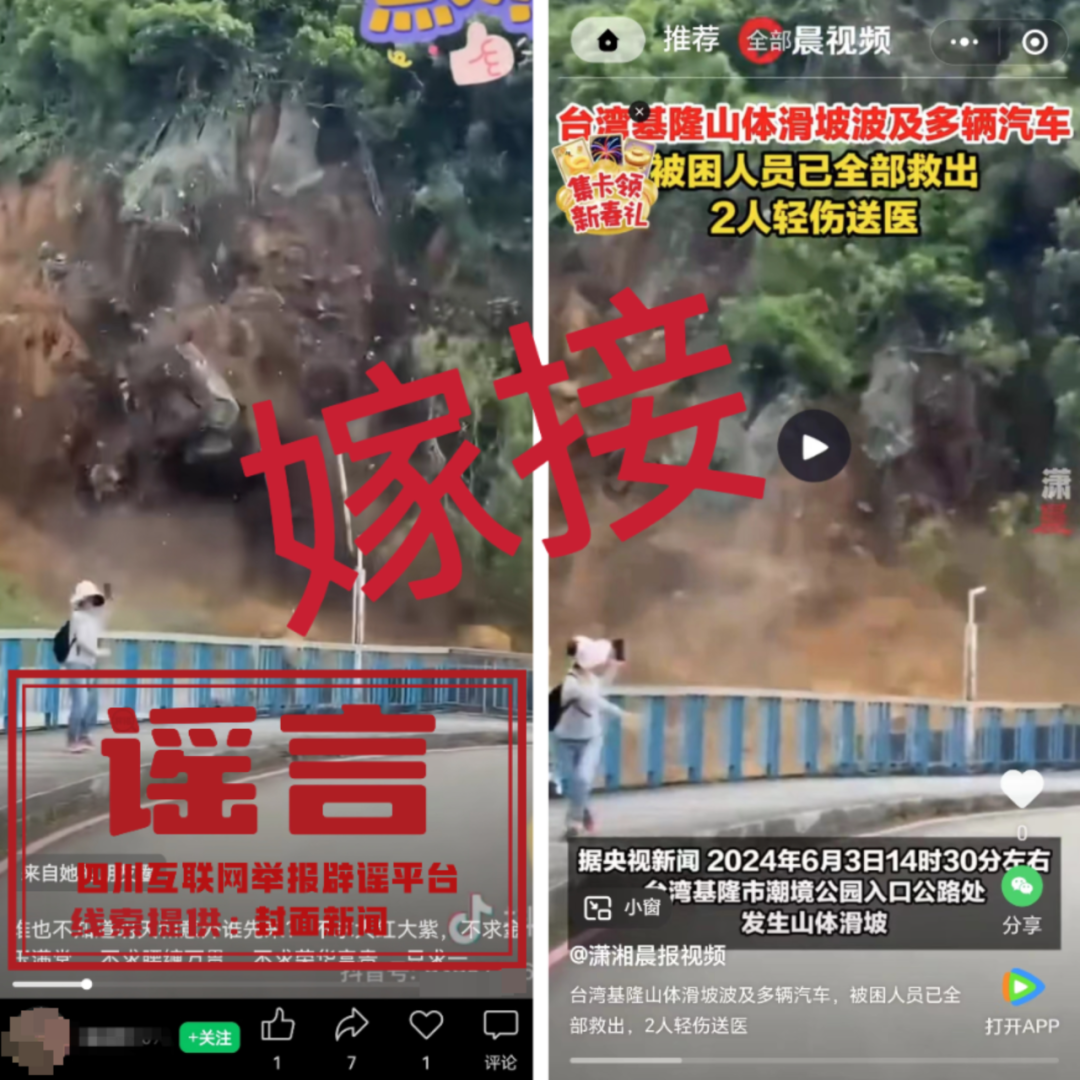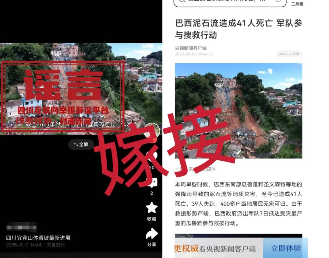 四川宜宾核查出多条筠连山体滑坡“移花接木”假信息 2025-02-14 11:22 2月13日,记者从四川省宜宾市获悉,在宜宾筠连沐爱金坪村2组发生山体滑坡后,当地核查出多条“移花接木”误导社会公众的信息。 经核查,某账号发布的“四川宜宾山体滑坡最新进展”视频画面实际为2020年巴西泥石流画面;一账号将2024年6月台湾基隆山体画面“嫁接”至筠连山体滑坡画面;某账号发布的“遭遇山体滑坡4名学生深陷泥潭 路过的司机赵学斌冒险将他们一一救出 ”信息,实际为2022年四川凉山一山体滑坡旧闻。 以下为不实信息及对比图: