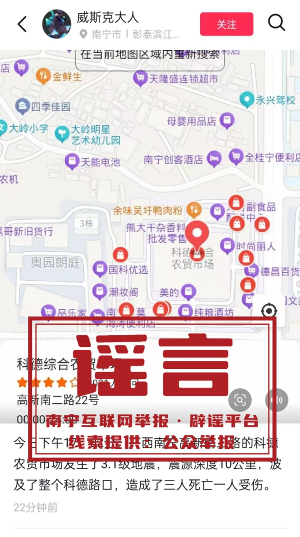 2月12日,有网友在某短视频平台发文称“今日下午17:02分,广西南宁高新南二路的科德农贸市场发生了3.1级地震。”