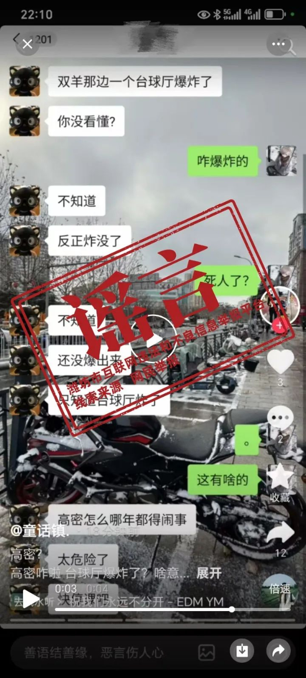 近日,网络上流传着关于山东“潍坊高密市一台球厅发生爆炸”信息。经向当地公安、应急、消防等部门和属地多方核实,高密市未发生台球厅爆炸事件,网络上传播的信息是谣言!