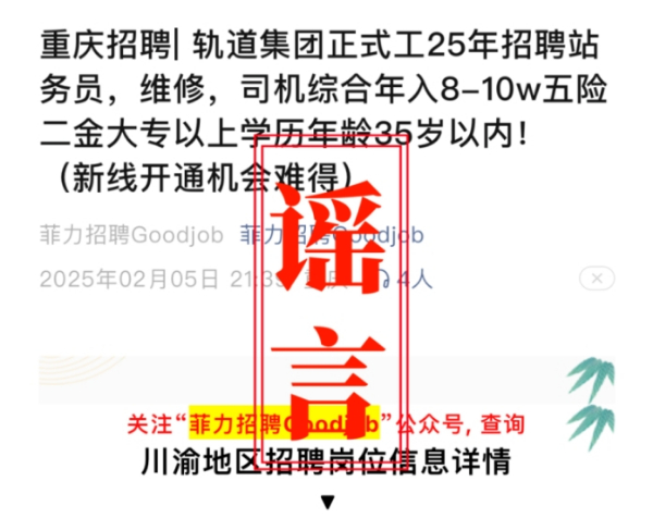 重庆轨道新线开通招司机年薪8-10万?官方辟谣 2025-02-17 14:31 节后正是求职旺季,近日,一则关于“重庆轨道集团招聘站务员、维修工、司机”的信息在自媒体号上流传,对此,重庆轨道集团辟谣称,该招聘信息为虚假内容,提醒广大求职者提高警惕。