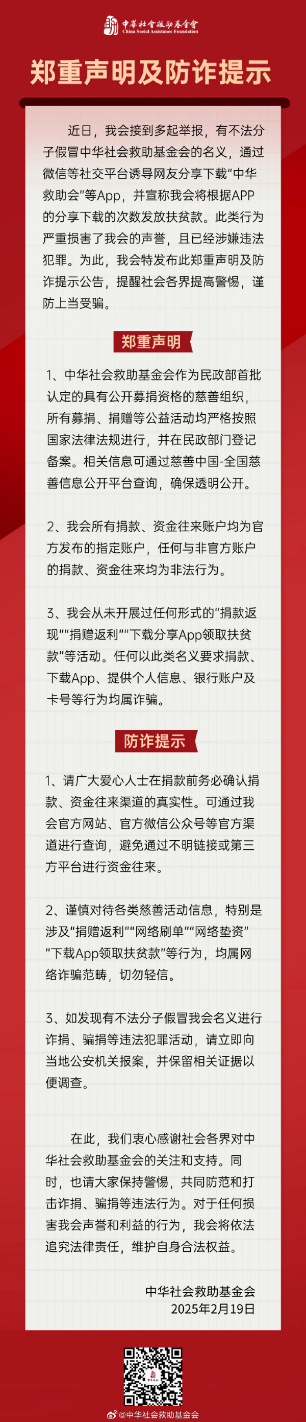 中华社会救助基金会发布郑重声明及防诈提示