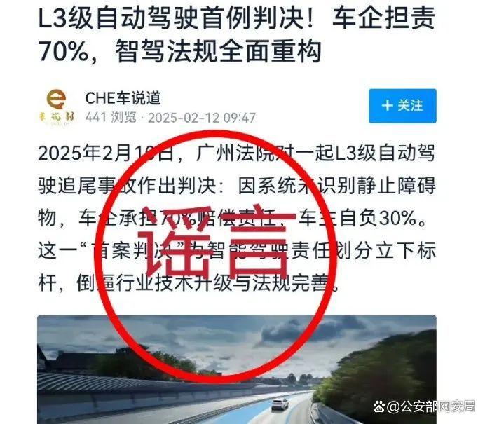 AI洗稿、谋取私利 公安部网安局:网警依法查处1起炮制涉某品牌汽车网络谣言案 2025-02-20 15:20 公安部网安局消息 工作发现,2月12日,一则“广州法院对一起某品牌汽车L3级自动驾驶追尾事故作出首例判决”的网络谣言在网上广泛传播,引发舆论关注,造成不良影响。公安机关网安部门迅速开展核查。 经查,2月12日9时47分,网民“CHE车说道”在某平台发布一篇《L3级自动驾驶首例判决!车企担责70%,智驾法规全面重构》的谣言信息称:2024年12月,车主王某驾驶某品牌汽车开启L3级自动驾驶在高速公路行驶,期间车辆未识别前方故障货车导致追尾,造成1死2伤。因系统未识别静止障碍物,广州法院于2025年2月10日判决车企承担70%的赔偿责任。文章将此案冠以“国内首例智能驾驶致死案”,炒作此案“将为智能驾驶责任划分立下标杆,倒逼行业技术升级与法规完善”(部分内容截图如下)。