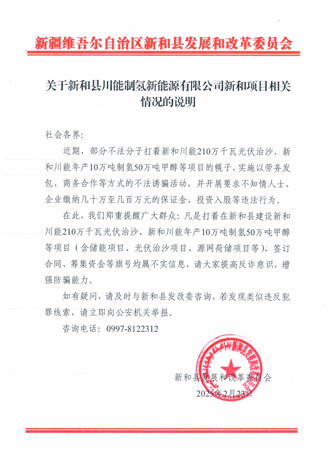经与相关部门核实,凡是以“新和县川能210万千瓦光伏治沙”“年产10万吨制氢50万吨甲醇项目”名义签订合同、募集资金或发布融资信息的,均属不实信息。