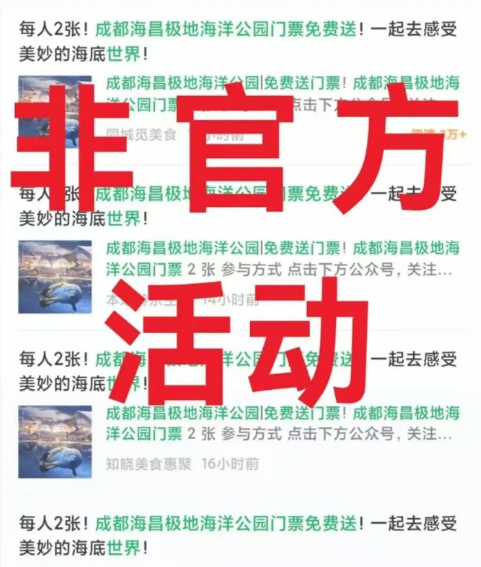 近期,部分自媒体账号在网络平台发布“成都极地海洋公园门票免费送”相关活动,引发舆论关注。
