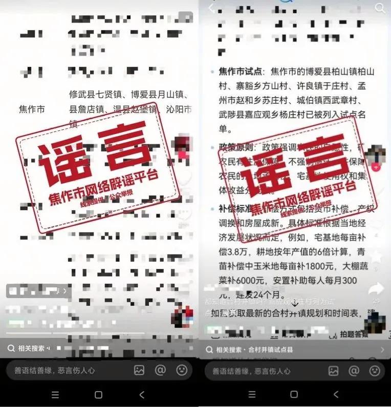 网信焦作消息 近日,焦作市网信办接群众举报,多个平台账号发布不同版本河南合村并镇名单,相关信息中涉及焦作的沁阳市、孟州市、博爱县、温县、修武县、武陟县。经核实,确认这些信息系虚假不实信息。其中,某平台个人账号发布信息称“河南焦作合村并镇补偿太低”,严重误导网民,焦作市网信办已责令账号主办者删除相关信息。
