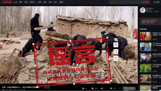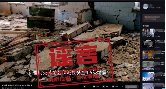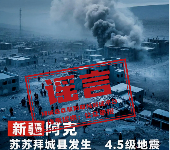 新疆某地地震致3人死亡?假 2025-03-06 20:09 据中国地震台网消息,3月5日18时53分在新疆阿克苏地区拜城县(北纬42.00度,东经82.54度)发生4.5级地震,震源深度17千米。 地震发生后,有自媒体账号在网上散布所谓“拜城县发生5.4级地震,已致3人死亡,65户房屋不同程度受损”的谣言信息,并利用AI技术手段拼接网络旧图,发布与此次地震不符的图文、音视频等虚假信息误导公众。拜城县应急管理局发布辟谣声明:经全面摸排,此次地震未造成人员伤亡和财产损失。