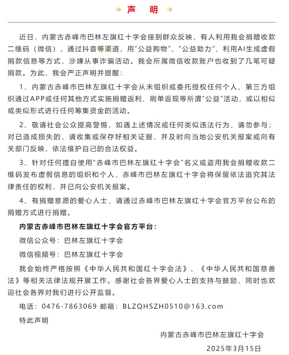 谨防诈骗!内蒙古赤峰市巴林左旗红十字会严正声明!