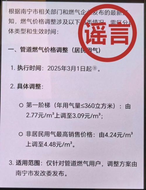 南宁燃气价格上涨?借AI造谣,罚! 2025-04-11 21:00 近日,一张关于燃气涨价的不实信息图片在网络群组流传,引起当地网民关注,纷纷议论燃气价格上涨问题,造成不良影响。