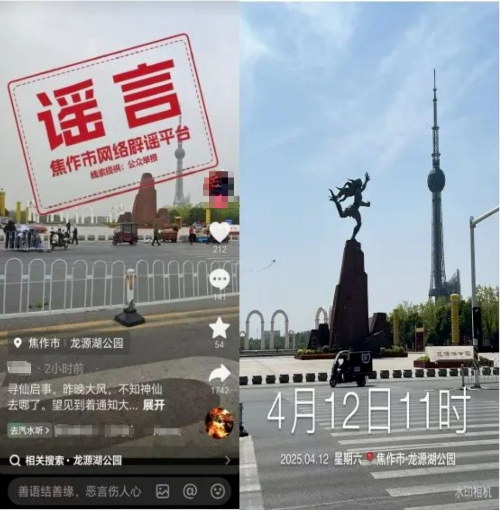 4月12日,河南省焦作市网信办接网民举报,某平台个人账号发布视频称:“昨晚大风,不知神仙去哪了。”视频显示,位于焦作龙源湖公园的夸父雕像不见了。经现场查证,雕像还在原处,视频内容为不实信息。目前,焦作市网信办已对账号主办者进行批评教育,当事人主动删除相关不实信息。