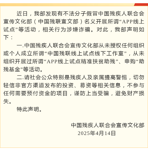 近日,有不法分子假冒中国残疾人联合会宣传文化部(中国残联宣文部)名义开展所谓“APP线上试点”等活动,相关行为涉嫌诈骗。对此,中国残疾人联合会宣传文化部发布声明表示:从未授权任何组织或个人成立所谓“中国残联线上试点线下工作室”,从未组织开展过所谓“APP线上试点精准扶贫助残”、申购“助残基金”等活动。请社会公众特别是残疾人及亲属提高警惕,切勿轻信非官方渠道发布的投资、募资等相关信息,不参与任何需要预付资金的项目,谨防上当受骗,避免财产损失。