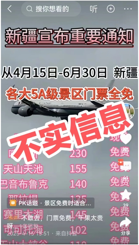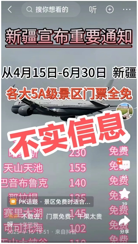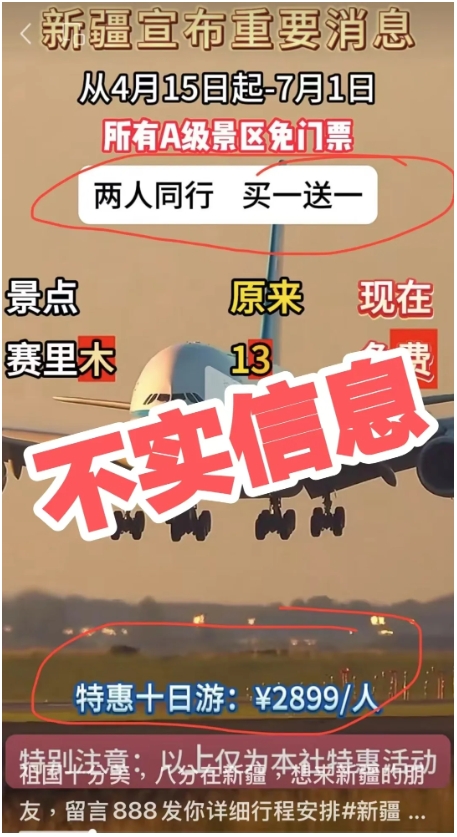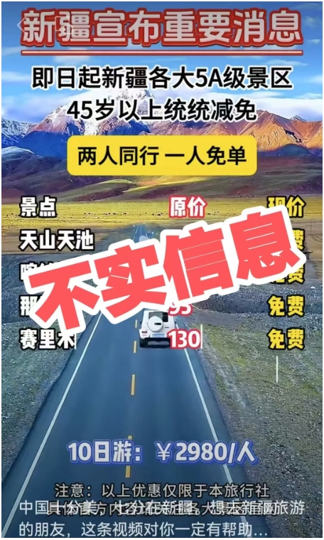 近日、一则“4月7日−6月30日,新疆各大5A级景区门票全免,注意以上优惠,仅限于本旅社……”的信息在多个新媒体平台发布,引发网民关注。