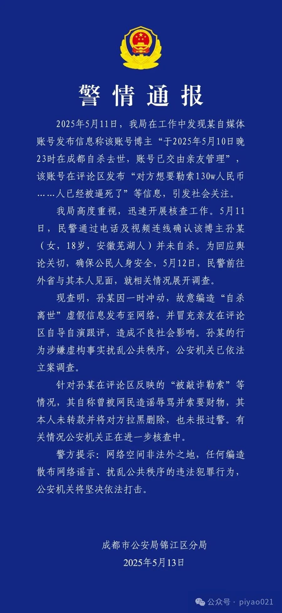 随着5月13日凌晨成都市公安局锦江区分局发布警情通报,百万粉丝网红“是小念噢”自编自导“自杀离世”的闹剧暂告段落。