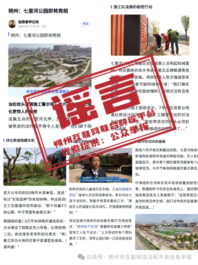 山西朔州七里河公园建设存在异常现象?谣言 2025-05-14 16:13 近期,网络上出现关于山西“朔州七里河公园建设存在的一系列异常现象”,包括“施工挖出宋元石构件”“凌晨秘密施工”“存在神秘放射性设施”“儿童区磁场异常”等内容,引发部分网民关注。经属地相关部门核实,均为虚假信息,望广大网民不听、不信、不传。