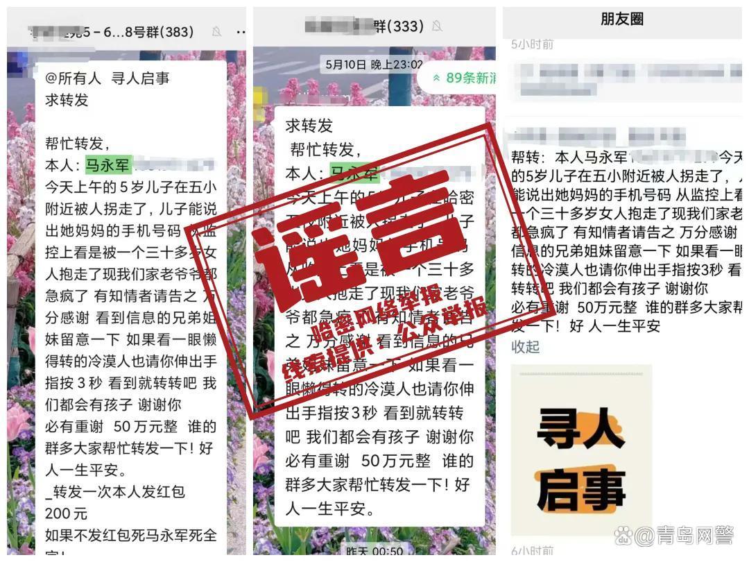 马永军5岁儿子被拐,家属悬赏50万寻人?假 2025-05-14 18:28 近日,微信群圈流传一则“马永军5岁儿子在五小附近被拐,家属悬赏50万寻人,转发红包200元”等信息,经核实,该信息为虚假内容。