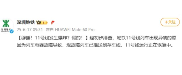 深圳地铁官方微博6月17日通报:经初步排查,地铁11号线列车出现异响的原因为列车电器故障导致,现故障列车已推送到存车线,11号线运行正在恢复中。