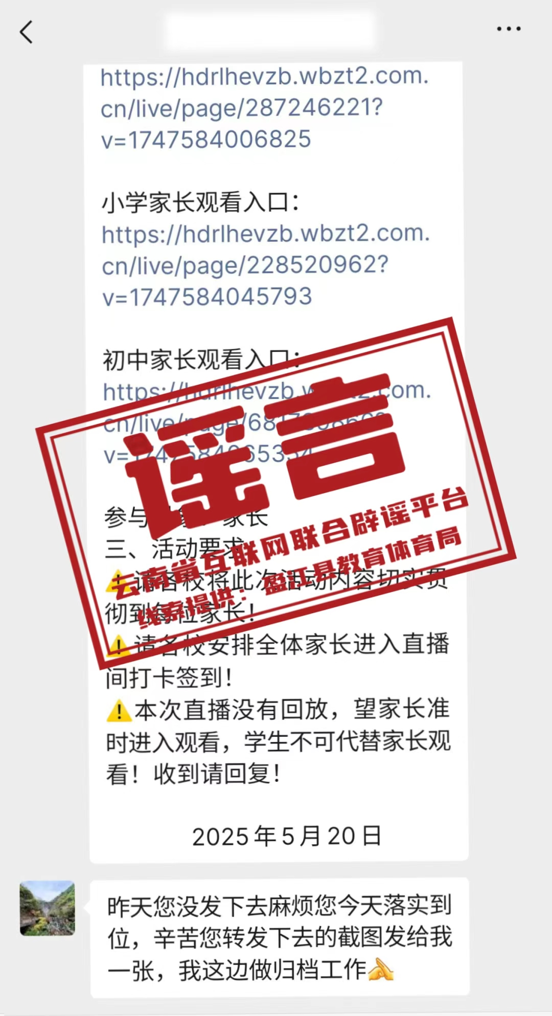 一、经核实,盈江县教育体育局近期未发布或转发任何以“校园安全健康”为主题的讲座直播链接,也未要求组织辖区内学生及家长观看此类直播。 二、若需开展面向学生的健康知识等培训活动,盈江县教育体育局将严格通过官方网站、政务公众号等正规渠道和平台进行发布与开展。 三、请广大群众务必提高警惕,此类虚假直播可能是不法分子以教育之名实施的诈骗行为。切勿随意打开链接购买产品,更不要泄露银行卡密码、短信验证码等本人及家人信息,谨防陷入诈骗陷阱。 四、对任何冒用“盈江县教育体育局”名义、单位领导及职工身份发布虚假信息的行为,我局将依法追究其法律责任。 盈江县教育体育局 2025年6月24日 来源: “网信云南”微信公众号 作者: 编辑:李佳萌 |