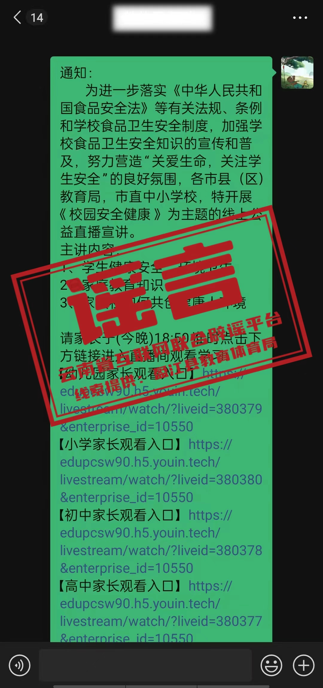 这类讲座是假的!云南省德宏州盈江县发布紧急提醒 2025-06-27 10:49 近期,德宏州盈江县有微信群内流传以《校园安全健康》为主题的线上公益直播宣讲信息,盈江县教育体育局近期未发布或转发此类讲座直播链接,也未要求组织辖区内学生及家长观看此类直播。为切实保障广大学生及家长的合法权益,盈江县教育体育局发布紧急提醒: