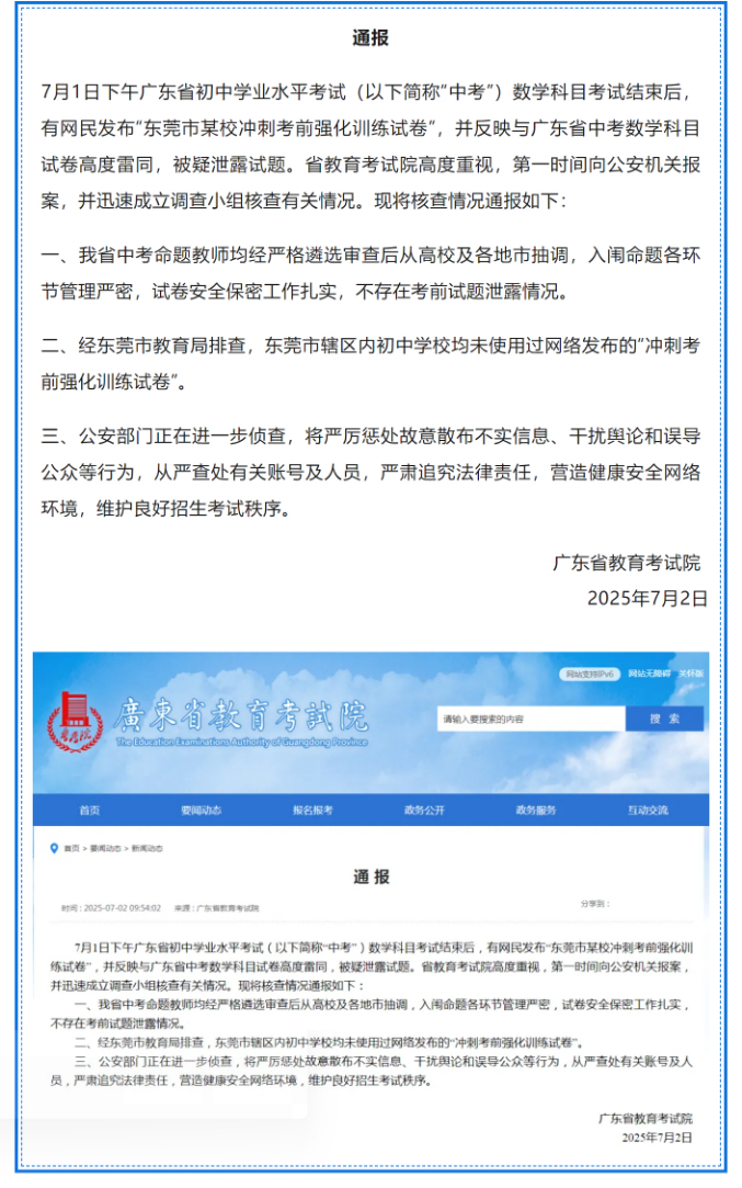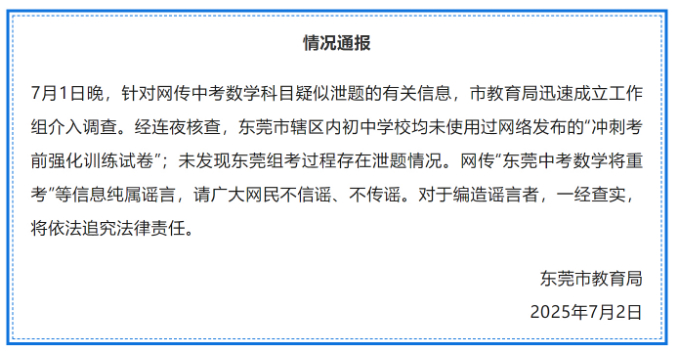 6月30日,2025年东莞中考开考。7月1日下午,数学科目开考,当晚网络上流传出“疑似数学科目泄题”“东莞中考数学重考”等信息。对此,广东省教育考试院、东莞市教育局发布通报,以下为通报原文: