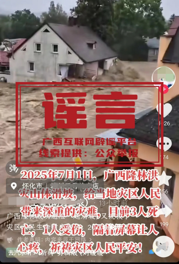 辟谣 | 网传“广西隆林洪灾造成12人死亡”“广西隆林洪灾山体滑坡目前3人死亡”为不实信息 2025-07-03 16:14 7月3日,部分网民在短视频平台发布视频称“广西隆林洪灾造成12人死亡”“ 2025年7月1日,广西隆林洪灾山体滑坡,给当地灾区人民带来深重的灾难,目前3人死亡,1人受伤,隔着屏幕让人心疼,祈祷灾区人民平安!”引发网民关注。