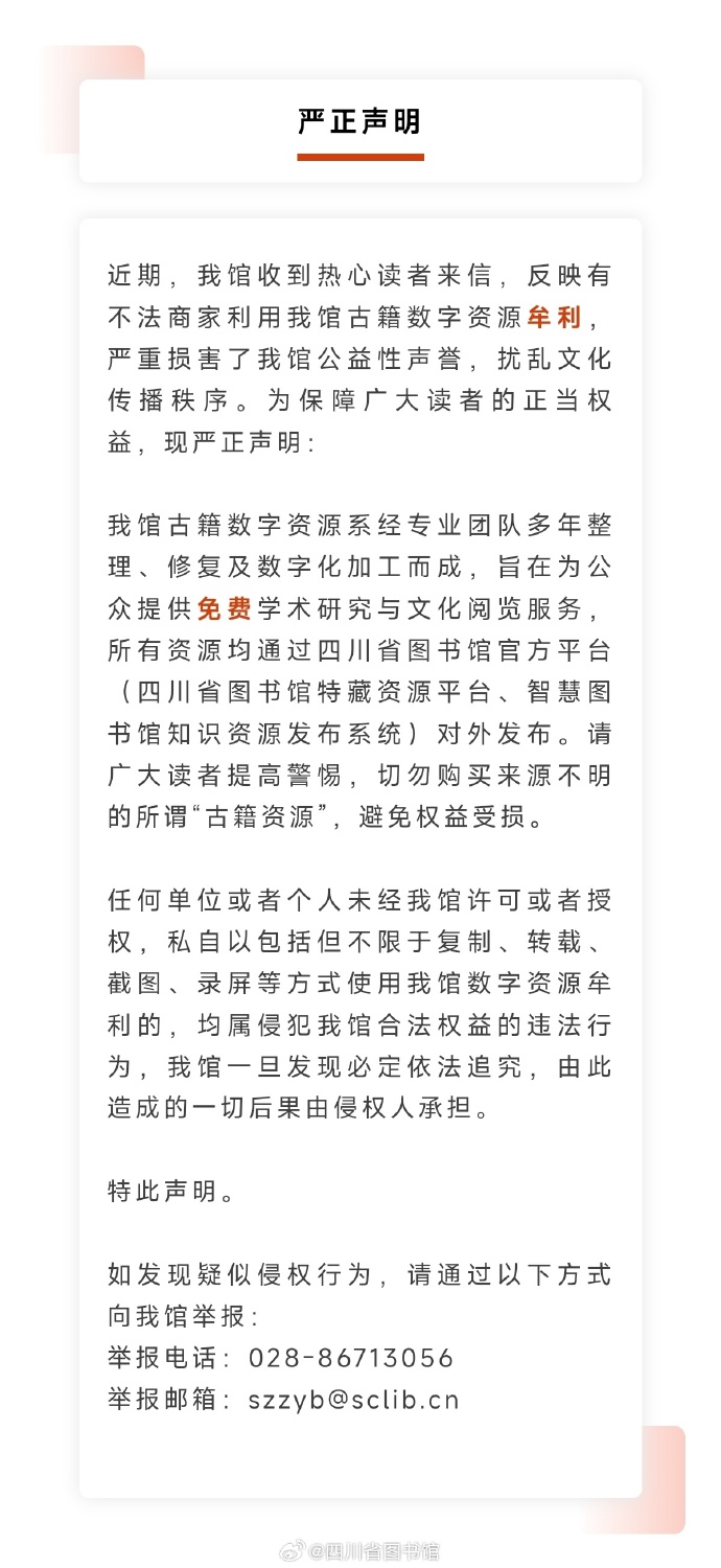 四川省图书馆发布严正声明 2025-07-04 10:27 严正声明 近期,我馆收到热心读者来信,反映有不法商家利用我馆古籍数字资源牟利,严重损害了我馆公益性声誉,扰乱文化传播秩序。为保障广大读者的正当权益,现严正声明: 我馆古籍数字资源系经专业团队多年整理、修复及数字化加工而成,旨在为公众提供免费学术研究与文化阅览服务,所有资源均通过四川省图书馆官方平台(四川省图书馆特藏资源平台、智慧图书馆知识资源发布系统)对外发布。请广大读者提高警惕,切勿购买来源不明的所谓“古籍资源”,避免权益受损。 任何单位或者个人未经我馆许可或者授权,私自以包括但不限于复制、转载、截图、录屏等方式使用我馆数字资源牟利的,均属侵犯我馆合法权益的违法行为,我馆一旦发现必定依法追究,由此造成的一切后果由侵权人承担。 特此声明。 如发现疑似侵权行为,请通过以下方式向我馆举报: 举报电话:028-86713056 举报邮箱:szzyb@sclib.cn