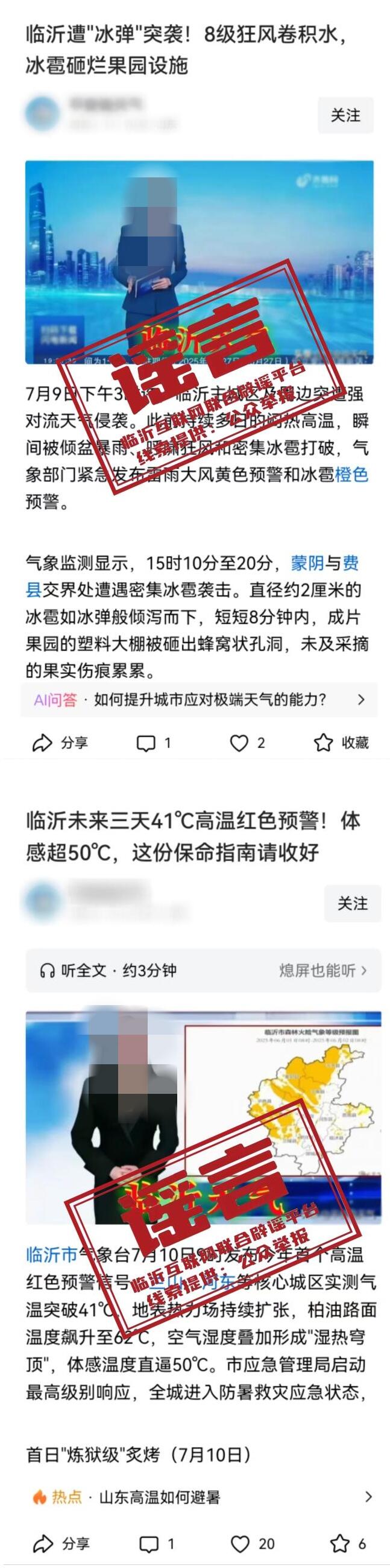 提醒广大网民:网络不是法外之地,请勿发布、传播来源不明的信息,不造谣、不信谣、不传谣,合力营造清朗的网络空间。 临沂大风冰雹砸烂果园?官方辟谣! 近日,某头条账号发布“临沂遭‘冰弹’突袭!8级狂风卷积水,冰雹砸烂果园设施”“临沂未来三天41℃高温红色预警!”等信息。经向临沂市气象部门核实,近期临沂未发生大风冰雹天气,未发布此类预警,上述信息均与实际情况不符,确为谣言。