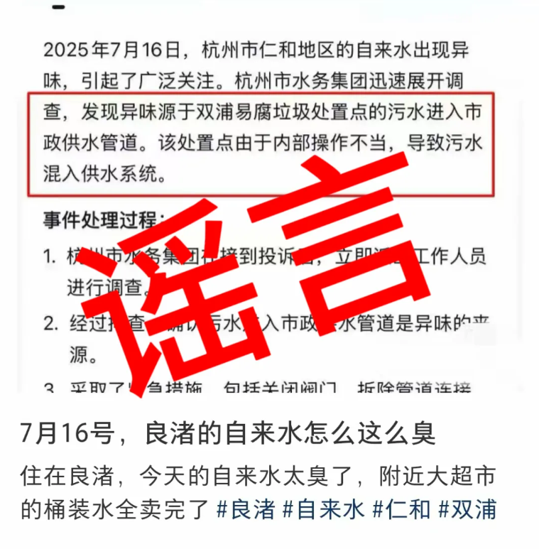 网传“经杭州市水务集团紧急调查,确认异味源于双浦易腐垃圾处置点操作不当,导致污水混入市政供水管道”的相关信息为不实信息,请广大市民朋友,对未经核实的信息不信谣、不传谣。
