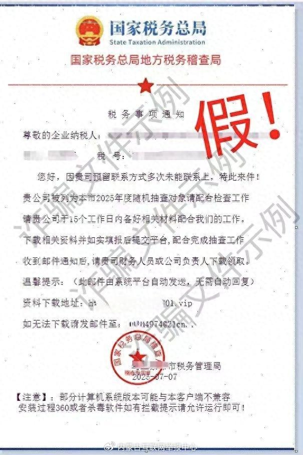 近期,有不法分子冒充税务工作人员,向乌海市企业发送电子邮件,以开展2025年度税收抽查为由实施诈骗。